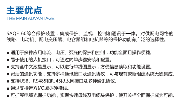 1、 灵活的逻辑编辑功能 2、 可靠的保护性能 3、 支持多种通讯规约 4、 支持电弧光保护解决方案